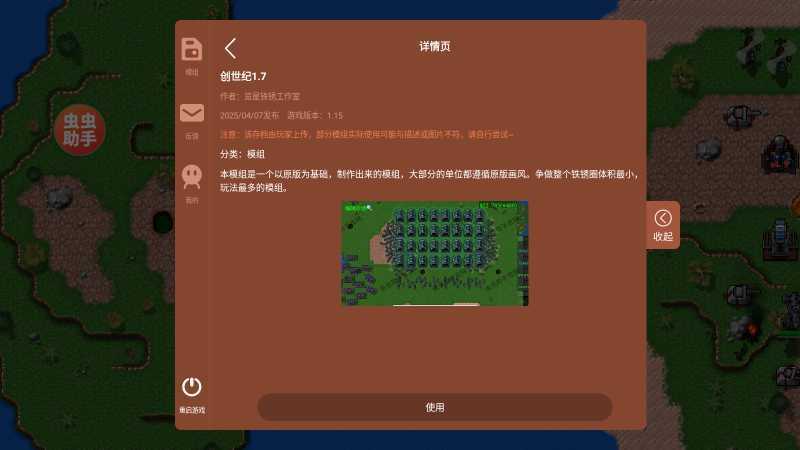 1、进入游戏后点击左侧的虫虫助手图标,点开后下载需要使用的模组。