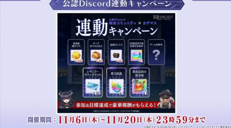 于 11 月份官方 Discord 连动活动,期间内 11 月 6 日至 11 月 20 日参与并达成目标即可获得豪华报酬奖励,分别为 魔力结晶、精选转蛋抽卡券、装备箱、最高级魔汁、汉堡 以及 游戏内称号,并额外实施实体週边抽选。