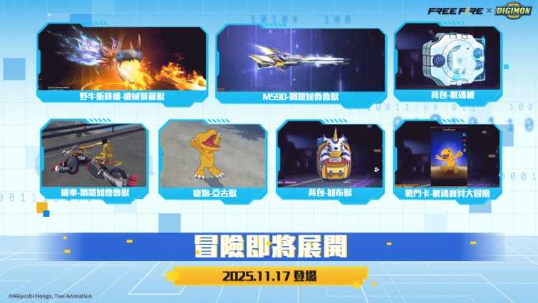 Garena 宣布《Garena Free Fire》与传奇动漫IP《数码宝贝大冒险》展开合作,于 11 月 17 日将数码宝贝系列的首部电视动画《数码宝贝大冒险》带进《Garena Free Fire》。粉丝和玩家将可以解锁游戏内造型,包含阿武 & 巴达兽头饰、手榴弹 – 盖亚能量炮、野牛衝锋枪 – 机械暴龙兽、亚古兽宠物等等。