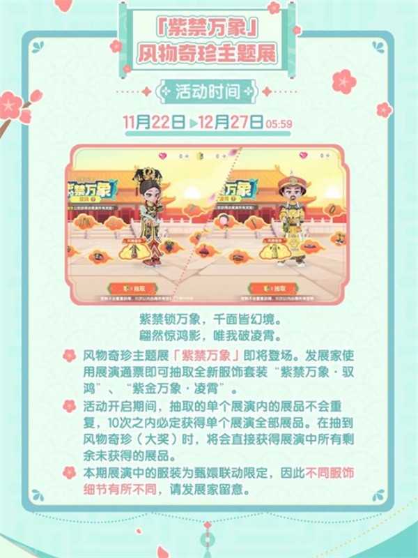 4、联动期间将开启 甄嬛主题风物奇珍展,收集展品可获取联动限定家具与动作,装点小镇,增添古典风情。